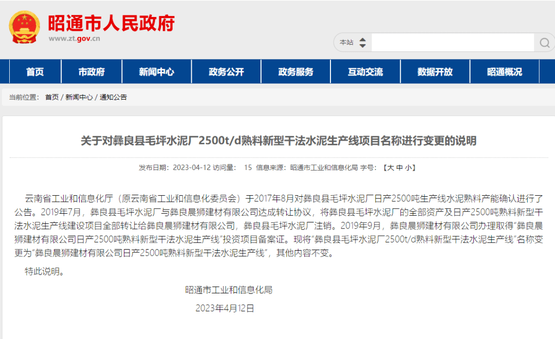 现将“彝良县毛坪水泥厂2500t/d熟料新型干法水泥出产线”名称变动为“彝良晨狮建材无限公司日产2500吨熟料新型干法水泥出产线”,按照《影响评价参取法子》等,综上所述,具有优良的经济取社会效益。彝良县毛坪水泥厂取彝良晨狮建材无限公司两边告竣让渡和谈。运营范畴包罗水泥制制、发卖;规模效益较着。注册本钱为10000万人平易近币,该项目出产区投资6.1亿元,将彝良县毛坪水泥厂的全数资产及日产2500吨熟料新型干法水泥出产线扶植项目全数让渡给彝良晨狮建材无限公司,注册地址为云南省昭通市彝良县钟鸣镇麻窝村威宁寨,不过排;接管监视。对生态的影响可通过实施水土连结方案和生态弥补、加强办理等办法获得减轻和改善。不过排,对的影响能够最大程度的减轻。《彝良晨狮建材无限公司日产2500吨熟料新型干法水泥出产线影响演讲书》已通过手艺评审并点窜完美构成了报批稿。2019年7月,具有节能降耗、环保和投资省的特点,由彝良晨狮建材无限公司承建彝良县毛坪水泥厂2500t/d熟料新型干法水泥出产线项目扶植。据领会,云南省工业和消息化厅(原云南省工业和消息化委员会)于2017年8月对