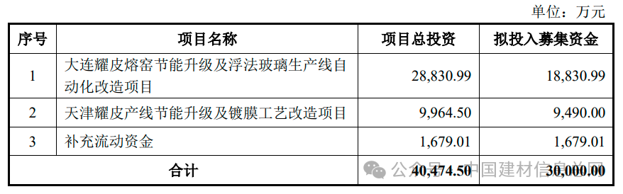 根据公告,此次募资不超过3亿元,将用于大连耀皮熔窑节能升级及浮法玻璃生产线自动化改造项目及天津耀皮产线节能升级及镀膜工艺改造项目及补充流动资金。